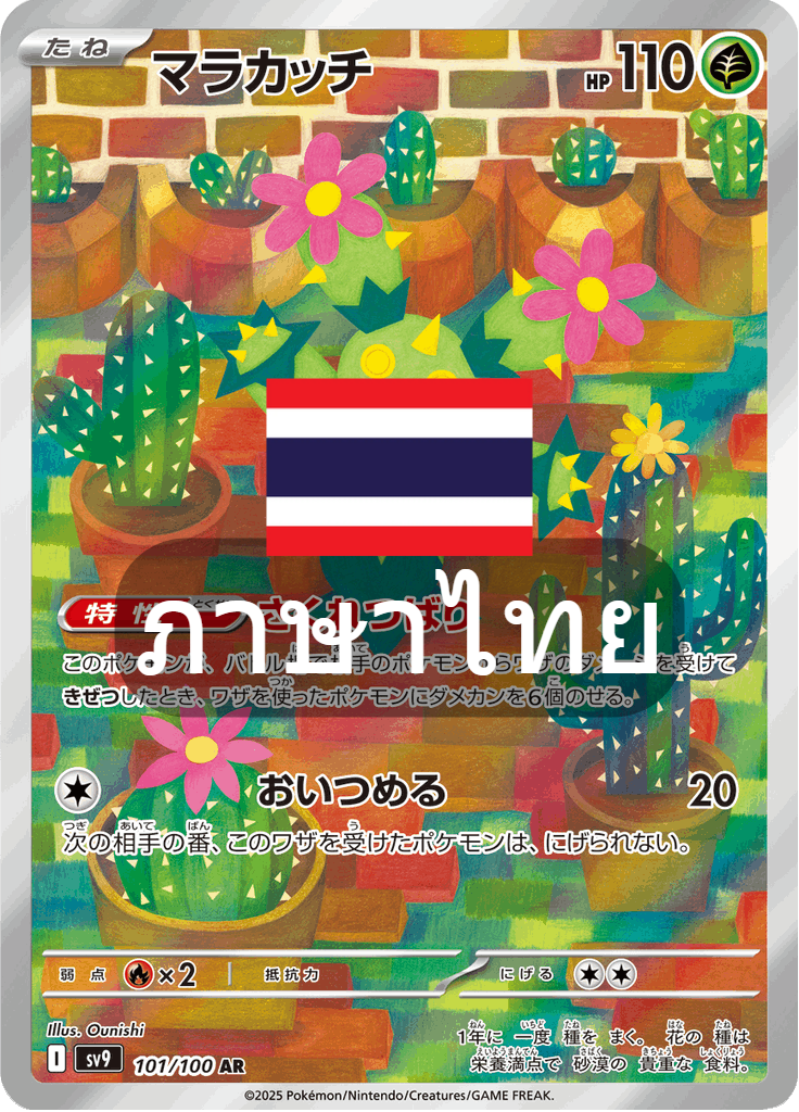 Maracaschi Name (English): Maractus Card games : Pokemon Trading Card Game Set: Threads of Destiny Set code: SV9s T Card code: 142/139 Level : AR Card Type: Pokemon Draft: Basic HP: 110 Pokemon Type: Grass [Ability] Explosive Spikes When this Pokémon is in the Battle Position and takes attack damage from an opponent's Pokémon and is [Knocked Out], place 6 damage counters on the Pokémon that used the attack. [Colorless] Chase 20 On your opponent's next turn, the Pokémon that received this move cannot flee. Weakness: [Fire] ×2 Escape: [Colorless][Colorless] Regulation symbol: I