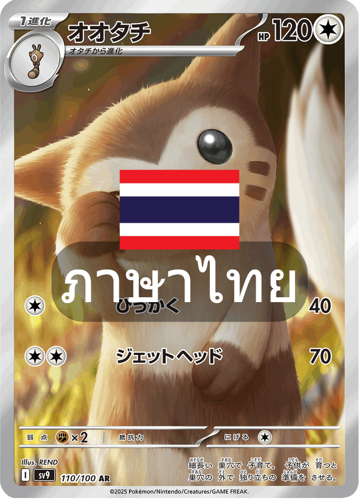 Oh Otachi Name (English): Furret Card games : Pokemon Trading Card Game Set: Threads of Destiny Set code: SV9s T Card code: 157/139 Level : AR Card Type: Pokemon Draft: Draft 1 HP: 120 Pokemon Type: Colorless [Colorless] Scratch 40 [Colorless][Colorless] Jethead 70 Weakness: [Fighting] ×2 Escape: [Colorless] Regulation symbol: I