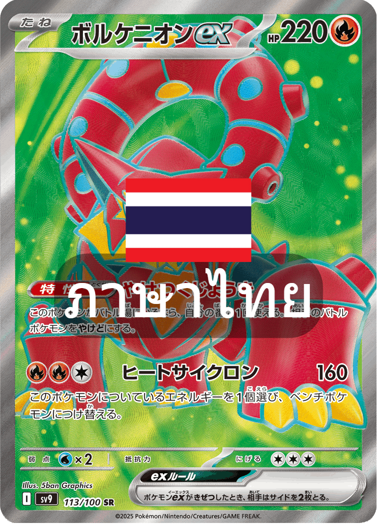 Volcanionex Name (English): Volcanion ex Card games : Pokemon Trading Card Game Set: Threads of Destiny Set code: SV9s T Card code: 161/139 Level : SR Card Type: Pokemon Draft: Basic HP: 220 Pokemon Type: Fire [Ability] Steam Burning If this Pokémon is in the Battle Position, once during your turn, you can inflict [Burn] on your opponent's Battle Position Pokémon. [Fire][Fire][Colorless] Heat Cyclone 160 Select 1 Energy attached to this Pokémon and move it to a Benched Pokémon. Weakness: [Water] ×2 Escape: [Colorless][Colorless][Colorless] Regulation symbol: I