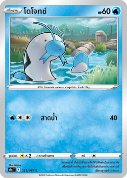 Dojotch Name (English): Barboach Card games : Pokemon Trading Card Game Set: Phasutham Maha Yut Set (English): Battle Region Set code: S9a T Card code: 021/067 Level : C Card Type: Pokemon Draft: Basic HP: 60 Pokemon Type: Water [Water][Colorless][Colorless] Splash water 40 Weakness: [Lightning] ×2 Escape: [Colorless] Regulation symbol: F