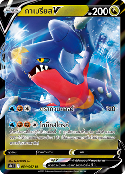 Gabriel V Name (English): Garchomp V Card games : Pokemon Trading Card Game Set: Phasutham Maha Yut Set (English): Battle Region Set code: S9a T Card code: 054/067 Level : RR Card Type: Pokemon Draft: Basic HP: 200 Pokemon Type: Dragon [Water][Fighting][Colorless] Dragon Claw 120 [Water][Fight][Fight][Colorless] Sonic Strike Discard 3 Energy attached to this Pokémon to the discard pile, then deal 220 damage to 1 Pokémon of your opponent. {Benched Pokémon do not factor in weaknesses and resistances.} Regulation symbol: F