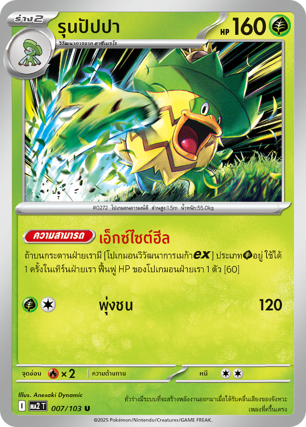 Runpappa HP 160 / type Fighting stance [Ability] Excite Heal If there is a [Mega Evolution?ex?] of type Grass on your board, use it once during your turn. Restore HP to 1 of your Pokémon. [60] crash 120 weakness Resistance escape ×2 -- I 007/103 evolution Hatsubo Hatsubrero Runpappa No. 272 ??The Happy Pokémon Height 1.5m / Weight 55.0kg. The entire body has systems that release energy when exposed to the sound waves of upbeat music. Illustrator Anesaki Dynamic