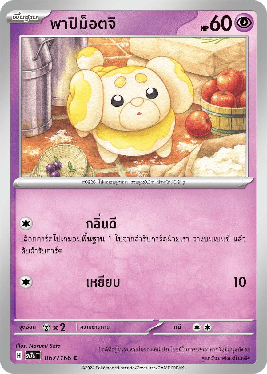Papimotji HP 60 / type Fighting stance Good smell Choose 1 [Basic] Pokémon card from your deck, place it on the bench, and shuffle your deck. tread 10 weakness Resistance escape ×2 -- H 067/166 evolution Papimotji Balzsel Balzsel ex No. 926 Puppy Pokémon Height 0.3m / Weight 10.9kg The yeast found in humans' breath is beneficial in cooking, which is why humans have been taking care of it since ancient times. Illustrator Narumi Sato