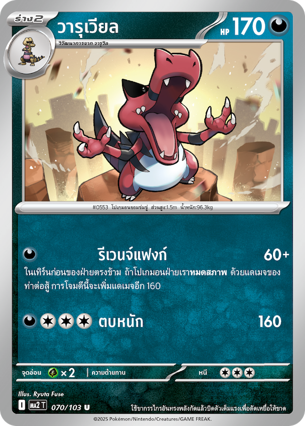 Varuviel HP 170 / type Fighting stance Revenge Fang 60+ In your opponent's previous turn, if your Pokémon was [Defeated] by a move's damage, this attack deals an additional 160 damage. Hard slap 160 weakness Resistance escape ×2 -- I 070/103 evolution Meguroko Waruvil Varuviel Varuviel EX No. 553 The Bullying Pokémon Height 1.5m / Weight 96.3kg Using its powerful jaws, it bites and twists with full force to cut its prey in half. Illustrator Ryuta Fuse