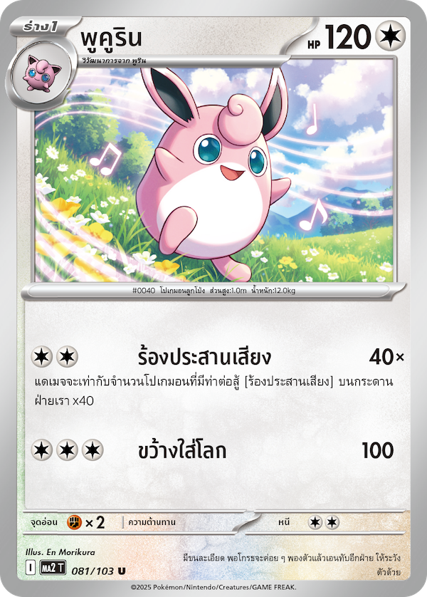 Pukurin HP 120 / type Fighting stance Singing in harmony 40× Damage is equal to the number of Pokémon with the [Singing] move on our side of the board x 40. Throw it at the world. 100 weakness Resistance escape ×2 -- I 081/103 evolution Purin Pukurin ex Pukurin No. 40 Balloon Pokemon Height 1.0m / Weight 12.0kg It has fine fur, and when angry, it will slowly puff itself up and lean over the other person. Be careful. Illustrator En Morikura
