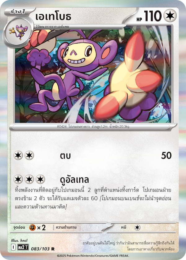 Atheboth HP 110 / type Fighting stance Slap 50 DualTel Discard 2 Energy cards attached to this Pokémon to the discard pile. 2 opposing Pokémon take 60 damage each. {Weaknesses and Resistances are irrelevant to Pokémon on the Bench.} weakness Resistance escape ×2 -- I 083/103 evolution Aipam Atheboth No. 424, Long-tailed Pokémon. Height 1.2m / Weight 20.3kg They live in large trees, and it is said that they can communicate with each other by wrapping their tails around their companions. Illustrator hncl
