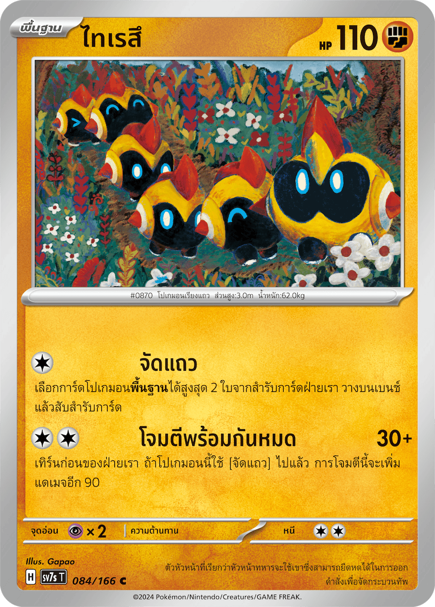 Tyretsu HP 110 / type Fighting stance Form a line. Choose up to 2 [Basic] Pokémon cards from your deck, place them on the bench, and shuffle your deck. Attack simultaneously. 30+ During our turn, if this Pokémon used [Line Up], this attack deals an additional 90 damage. weakness Resistance escape ×2 -- H 084/166 evolution Tyretsu No. 870 Pokémon lined up. Height 3.0m / Weight 62.0kg The leader, known as the military chief, would use his retractable horns to issue orders and organize the troops. Illustrator Gapao