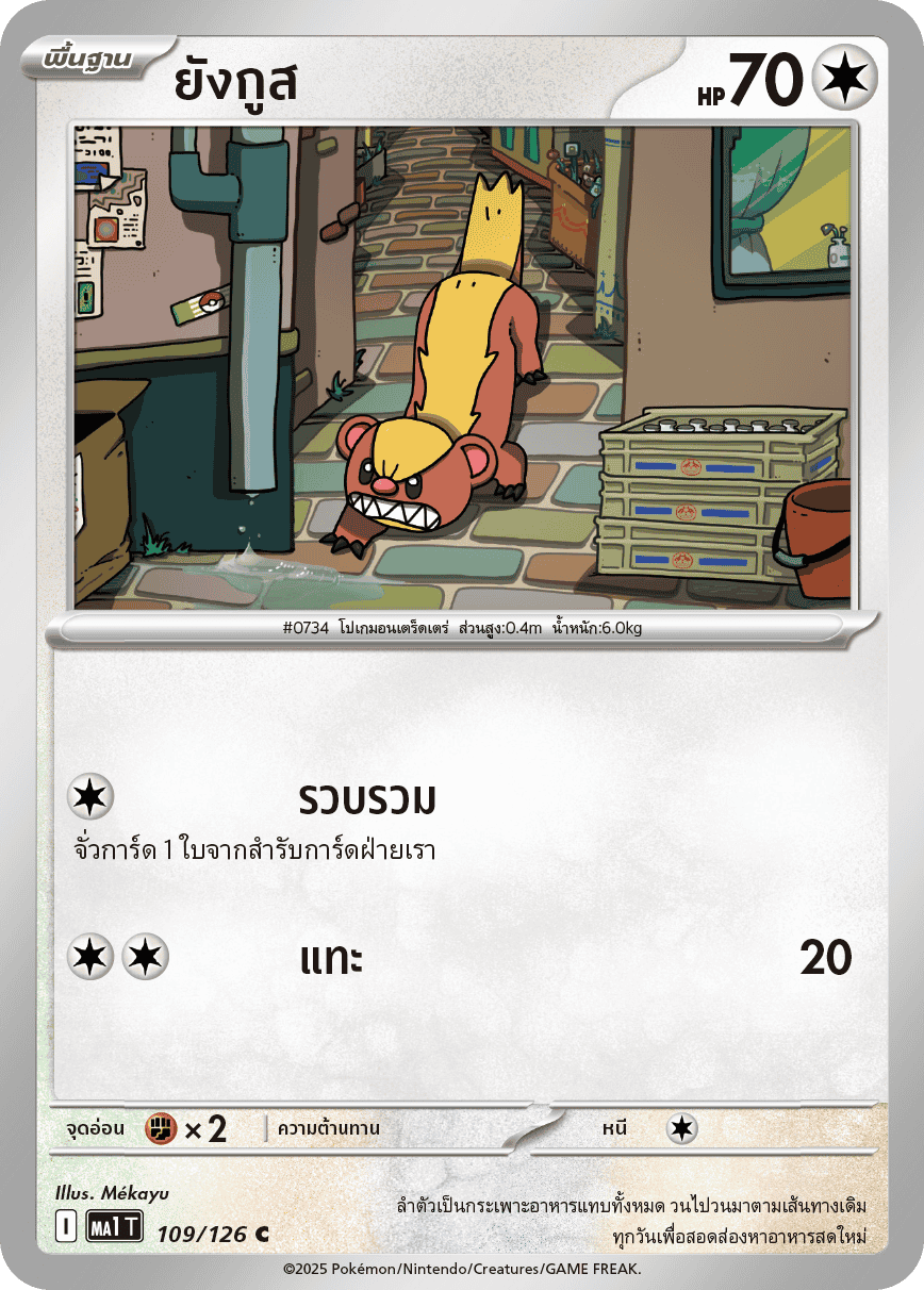Yangus HP 70 / type Fighting stance compile Draw 1 card from your deck. nibble 20 weakness Resistance escape ×2 -- I 109/126 evolution Yangus Decagus No. 734 Wandering Pokémon Height 0.4m / Weight 6.0kg Its body is almost entirely made up of its stomach, and it repeats its movements along the same path every day, searching for fresh food. Illustrator Mékayu